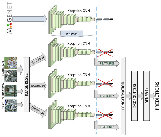 Still, extracting objects and details from images can be challenging due to their highly variable shape, size, color, and texture. To improve this, we proposed an ensemble model involving a multichannel CNN. Each channel is comprised of the input layer that defines the various sizes of input images, focusing on a particular scale. All channels share the standard CNN architecture in the transfer mode with the same set of filter parameters. The outputs from the three channels are concatenated and processed by dropout and dense layers (Figure 8). This architecture is expected to extract more robust features, i.e., to have greater resilience against large variations in object size.