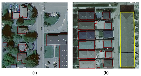 As previously mentioned, a mask representing building footprints from the cadaster is available for the automated calculation of the percentage of the image area occupied by buildings. It is reasonable to assume that the ground truth thus defined should be reliable. However, the analysis of the results showed that this approach also has weaknesses. As can be seen in Figure 10, the examples of the overlapped images show that sporadically there are discrepancies between cadastral maps and aerial photographs. The first problem is that sometimes there is an offset of the building footprints (Figure 10a), which does not necessarily affect the result unless the building is only partially shown in the figure. A more significant problem arises in the case where there are buildings in the pictures that are not registered in the cadaster (Figure 10b). This results in instances with ground truth errors identified in training, validation and test datasets.