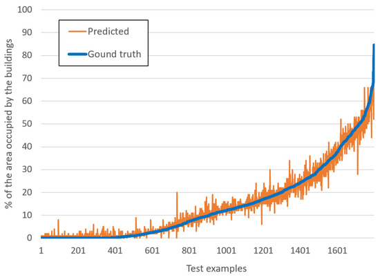Figure 11 shows the scatter plot of predicted values and the ground truth for the aerial images test dataset (1800 samples) and Xception * 3 model. Ground truth values (blue) are pre-sorted. Rare major discrepancies are mainly due to erroneous ground truth data.