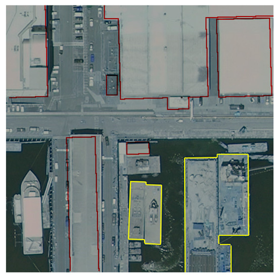 Figure 12 shows an example of an error generated by the model itself. Building footprints from the cadaster (red) were indicated, but the model estimated that moored vessels (yellow) also represented buildings.