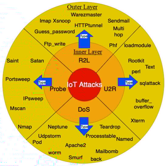 In Figure 4, the NSL-KDD dataset is represented by two layers: (1) the inner layer represents different types of IoT attacks in the dataset, such as Probe, DoS, U2R, and R2L; (2) the outer layer represents examples of attacks within each category. Attacks such as Saint, Satan, Nmap, and portsweep, which can be found in Figure 4, come under the Probe IoT attack category. In these attacks, the attacker scans a network device to determine potential weaknesses in its design, which are subsequently exploited in order to gain access to confidential information, as described in Section 4.