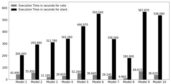Figure 5 displays the execution time for voting and stacking ensemble methods over all the models described in Table 2. The X-axis in Figure 5 refers to the duration in seconds to execute a model, while the Y-axis refers to the model number. Compared to the voting ensemble method, stacking takes a much higher execution time. According to our results, model number 8, with the voting technique, shows minimal execution time (9.96 s), with KNN, NB, and DT used as base classifiers.