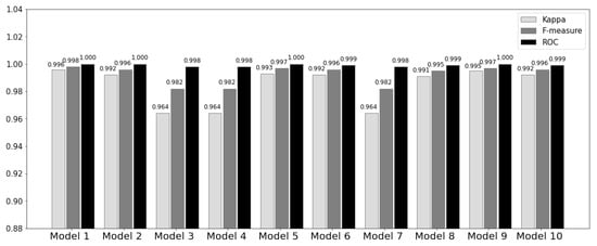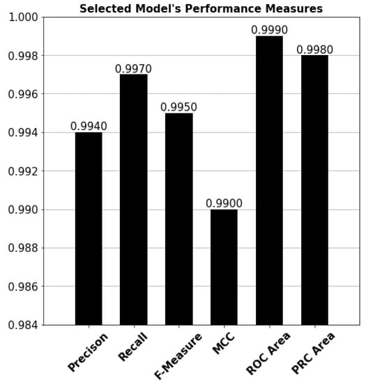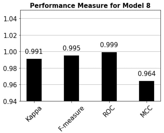 To verify further, we calculate the performance of model 8 in terms of precision, F-measure, MCC, and PRC area (Figure 8), in addition to all other metrics. Through the Y-axis, the result is accurate to three decimal places. The most significant performance metric is MCC, which indicates how random or real the prediction is. It ranges from −1 to 1. Model 8’s values in the experiment are typically closer to 99.99 percent. In general, model 8 with voting is highly optimized to run on the fog layer, according to the requirements of real-time execution and excellent performance.