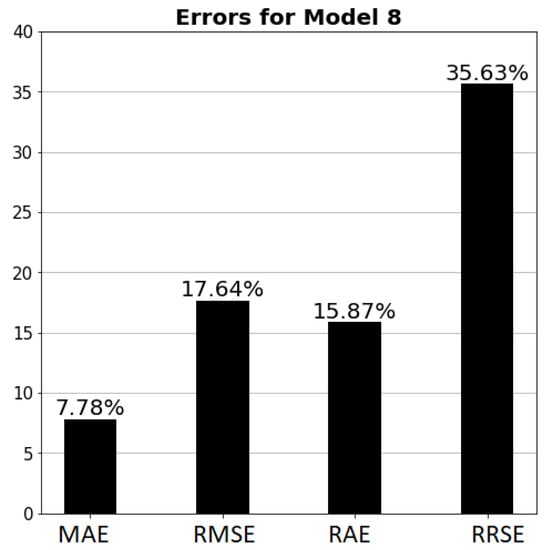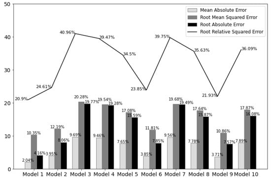 Figure 10 represents the mean absolute error (MAE), root mean square error (RMSE), relative absolute error (RAE), and root-relative squared error (RRSE). Our experiment yielded mean absolute error, root mean square error, relative absolute error, and root-relative squared error values of 7.78, 17.64, 15.87, and 35.63 percent, respectively.