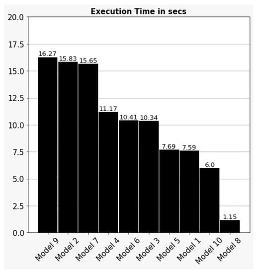 Along with the previously discussed performance metric, we also calculated the execution time of the chosen model, as well as all other models (not selected at the cloud layer) using voting as an ensemble method on the fog node. This execution time is shown in Figure 11. This is to determine whether we selected the correct model in terms of execution time. The fog node execution time of model 8 with voting was the fastest of all models.