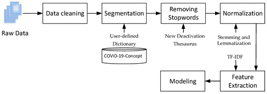 We adopted Chinese word segmentation (jieba) to segment Chinese text, and added a user-defined dictionary (dict. Txt) based on the new crown open concept knowledge graph publicly released on the OpenKG platform (COVID-19-Concept) to optimize the word segmentation results. Additionally, this study makes comprehensive use of the advantages of “Baidu deactivation Thesaurus”, “Harbin Institute of technology deactivation Thesaurus” and “Sichuan University Machine Intelligence Laboratory deactivation Thesaurus” to filter stop words [26,27]. We combined the contents of the three deactivation thesauruses to build a new deactivation thesaurus and deleted meaningless information so as to reduce the interference to the word segmentation results.