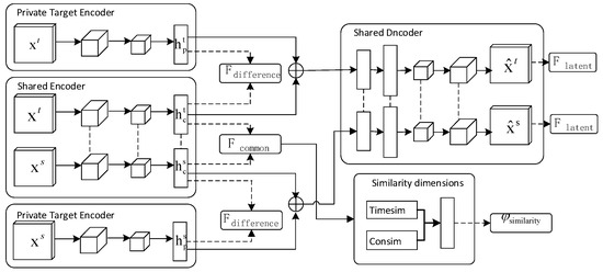 In the Figure 3, h c t and h c s are the hidden vectors of common features extracted from the D s and D t domain. h p t and h p s are the hidden vectors of private features extracted from the D s and D t domain. F c o m m o n is the similar feature extracted from the D s and D t domain by calculating the similarity between h c s and h c t , and F d i f f e r e n c e is the dissimilar feature extracted from D s and D t domain, which ensures that the private part still plays a role in learning task T s and T t . F l a t e n t is the latent feature which is further mined based on dissimilar features. φ s i m i l a r i t y is an indicator to measure the similarity between platforms, which is calculated by two dimensions: temporal similarity and conceptual similarity. Based on the φ s i m i l a r i t y value, the paper transfers the source domain samples to the target domain for training research.