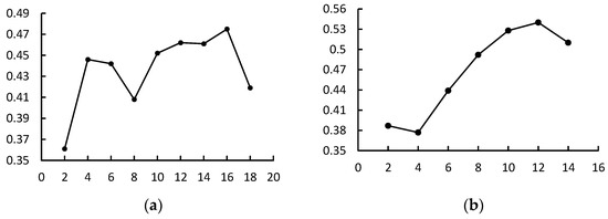 Through Gensim’s LDA Model method, the subject number range was set as [2,20], and the subject consistency scores of LDA models in the source domain and target domain under different subject numbers were obtained, as shown in Figure 6. The best number of subjects for the source domain T1 time slice data was obtained as 16, and the model’s perplexity is −6.9. For subjects in the target domain, the optimal number was 12, with the model’s perplexity equal to −5.27.