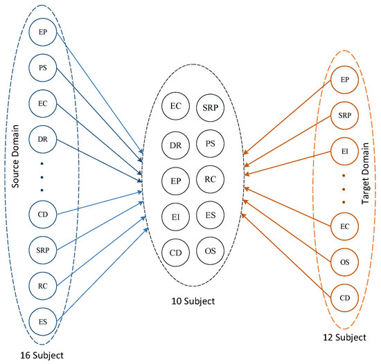 Figure 7. This is the subject classification of the source domain and target domain T1 time slice data: The T1 time slice of the source domain has 16 subjects; The T1 time slice of the target domain has 12 subjects. There are 10 subjects in the union of the two domains.