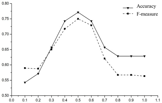 In order to obtain better experimental results, this paper sets the characteristic weight coefficient to change from 0.1 to 1 and carries out experiments according to the value of different parameters. According to the principle of TC-LDA model in Section 4.1, if the similarity threshold is set to 0.3, that is, for texts with a Similarity ( w 1 , w 2 ) 0.3, it is considered that the texts of the source domain and the target domain are similar, and transfer learning can be carried out. Otherwise, the texts are considered to be dissimilar samples, and the results are shown in Figure 8. When the feature weight coefficient λ = 0.5, the A c c u r a c y and F M e a s u r e value of TC-LDA model are the highest, so we set λ = 0.5 in this study.