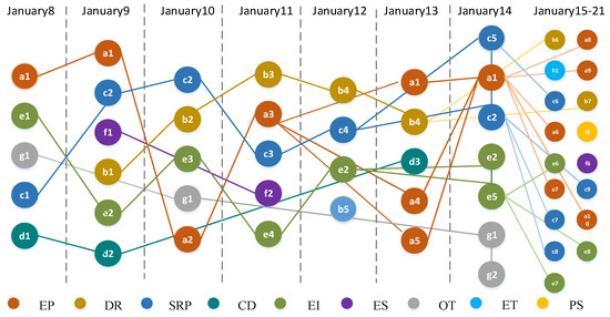 Each subject is composed of multiple words, and the same word may be contained in multiple subjects. For example, the 10 key words of the EP subject include “prevention and control, COVID-19, epidemic, combat, Novel Coronavirus, pneumonia, gather, disinfection, and Wuhan” (note: original data keywords are Chinese; this is translated data). Based on the above analysis, this paper is mainly divided into 10 subjects: epidemic condition (EC), data reporting (DR), epidemic prevention (EP), epidemic impact (EI), charity donations (CD), scientific research and popularization (SRP), people’s stories (PS), rumor clarification (RC), emotional subjects (ES), and other subjects (OS).