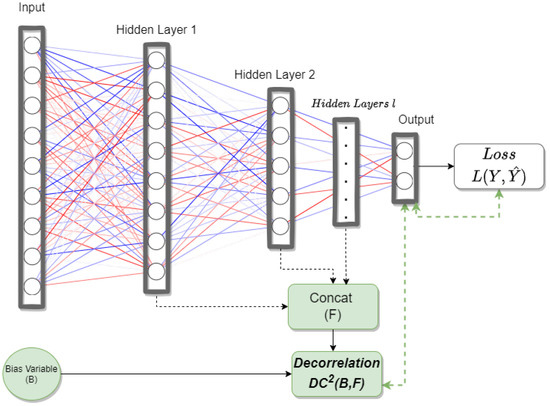 Here, x is the input size of p and after applying a transfer function to becomes the output of the first hidden layer, whereas w and b are weights and biases, i.e., parameters of the neural network. The variable (s) denotes the total number of hidden units in the first hidden layer and (l) denotes the total number of layers. We use the output of the first hidden layer as input F to our decorrelation function to reduce the dependencies of these output values on biases. Of course, it may be more appropriate to use just one or combinations of other layer outputs depending on the types of applications.