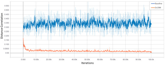We also plotted the decorrelation function against iterations in Figure 5 to compare the performance of models in regards to reducing the statistical dependence between features and bias variables. This figure shows the unsmoothed distance correlation values in light blue and light orange colors. In contrast, dark blue and dark orange colors indicate the smoothed distance correlation values which are calculated using exponential moving average. Smoothing is used to observe the overall trend. It shows that the distance correlation between features and bias variable decreases as the number of iterations increases for DcCNN as opposed to the baseline model.