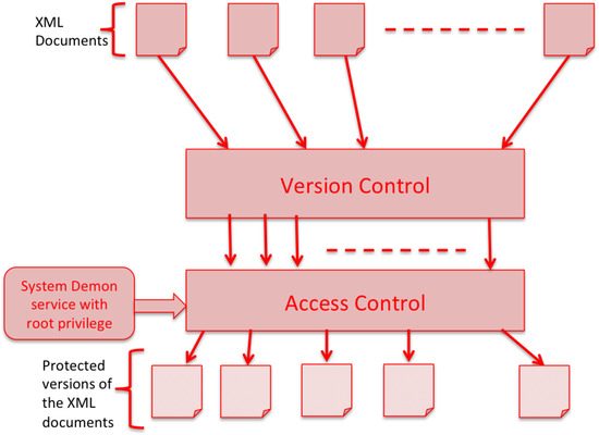 Figure 1 depicts the overall framework architecture. In this framework, all XML-based documents in a predefined directory go through the version-control module at the time of file closing to maintain the latest version of each document. The access-control module is activated by invoking the root daemon service to perform write protection for the snapshot version, which would be already pointing to the original file.