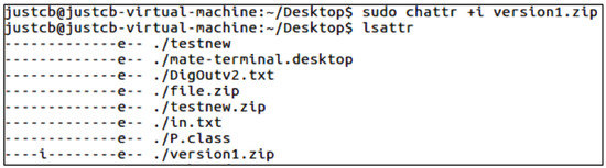 The access-control module is implemented as a root daemon that performs write/delete protection for the files produced by the version-control module each time a file version is created. This is achieved by running the chattr command (Change Attribute) with root privileges. chattr is a command line in Linux that is used to set/unset specific attributes to a file in a Linux environment to secure accidental deletion or modification of important files and folders, even by root users. Through this process, file snapshots are protected from corruption or deletion by using the change file attribute permissions with the immutable flag (i) under the Linux environment, preventing any user, including the root, from accidentally modifying and/or deleting files. An example using this command is shown in Figure 4.