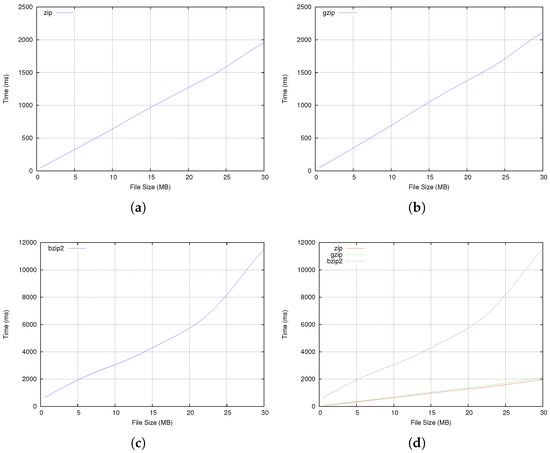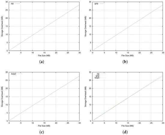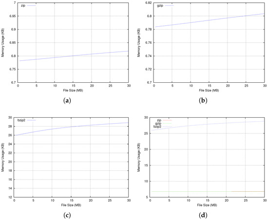 Figure 9a–c show how the memory usage changes against the original file size to create the snapshot in the proposed SH-VARR schema when leveraging the zip, gzip, and bzip2 compression algorithms. Figure 9d illustrates all cases together for comparison purposes. It is readily seen that the memory usage, for the cases when the zip and gzip compression algorithms are used, is almost fixed (around 6.8 KBs) where it does not show any dependence on file size. Meanwhile, memory usage for the case involving the bzip2 compression algorithm is seen to increase with increasing file size, then it remains constant (around 28 KBs) for files with large sizes. This is because all the compression algorithms (zip, gzip, and bzip2) involved in our assessment of the proposed framework do not capture the entire file into the memory. Instead, they acquire it as a stream requiring a specific amount of memory each time (i.e., takes a chunk of data of a specific size each time), and the amount needed depends on the compression method used and the file size involved.