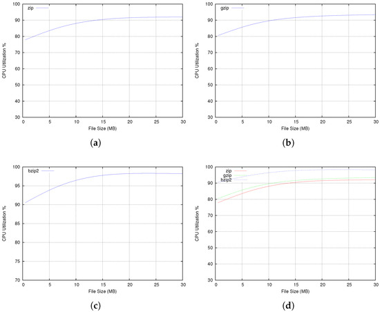Figure 8a–c show how the CPU utilization varies against the original file size for creating the snapshot in the proposed SH-VARR schema when leveraging the zip, gzip, and bzip2 compression algorithms, respectively. Figure 8d illustrates all cases together for the purpose of comparison. Here, CPU utilization is the amount of work handled by the CPU while creating a protected version for each file. Generally, for small files, CPU utilization increases with increasing file size. However, for larger file sizes, it levels off to some decent value. By monitoring the CPU utilization for each job executed when creating a protected version, we observed that when the bzip2 compression algorithm was used the CPU utilization was evidently the highest.
