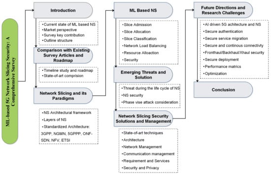 The rest of the paper is structured as follows: Section 2 contains a state-of-art comparison of existing surveys and road-maps. Section 3 and Section 4 discuss network slicing and its paradigms and various machine learning-based network slicing along with taxonomy, respectively. Section 5 and Section 6 include the emerging threats and security concerns, the taxonomy of network slicing attack prevention, and network slicing security solution and management, respectively. Section 7 consists of recommendations and future directions. Section 8 concludes the paper. This review paper also helps the future perspective and ideas among researchers. A graphical representation of the paper’s organization is depicted in Figure 1. We include the definition of frequently used acronyms in Table 1.