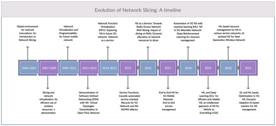 Figure 2 shows the evolution of Network Slicing, the year of conceptualization [], implementation [,] network virtualization [,] the concept of SDN [] and NFV [,], and different services for the users [,,,,]. From the year 2015, research in the field of Network Slicing accelerated, with the result of increasing the quality of services. Various Machine Learning (ML) [,,] and Deep Learning (DL) [,,,,] algorithms are being applied to manage slices, user requests, slice admissions, resources, and traffic in 5G network slicing. Various optimization algorithms [,] are also utilized to optimize the network functions.
