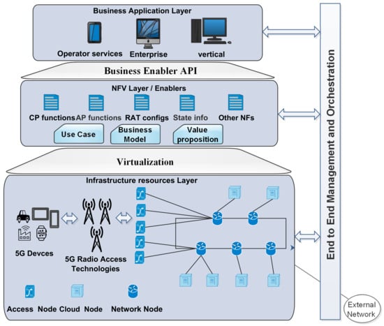 NGMN standardized architecture. Next Generation Mobile Network (NGMN) Alliance visualizes the 5G network as an end-to-end system with extreme productivity and feasibility. NGMN comprises both RAN and CN for E2E connectivity. NGMN justifies that the 5G network slicing system must be designed keeping in mind the current trends and principles such as dynamic radio topology and cost-effective deployment to create common composable cores, flexibilities, built-in security, and simplification of operations and management. Foukas et al. [] break the overall architecture into three layers as shown in Figure 5.