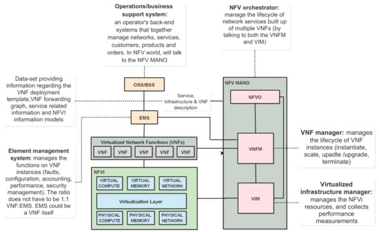 Network Function virtualization (NFV) standardized architecture. ONF-SDN architecture discussed the control plane features that enable network slicing architecture but lack effective management of network slicing and its essential resources. NFV architecture is comprised of the following: NFV Infrastructure (NFVI), a collection of resources; virtual network functions run on NFVI and MANO, consisting of a VNF Manager, Orchestrator and Virtualized Infrastructure Manager; and a Network Management System (NMS), which is comprised of Element Management (EM) and Operation/Business Support Systems (OSS/BSS) [,]. The NFV architecture works on the management of infrastructure resources and directs the allocation of the slices concerning the needs of the virtual networks and network services.