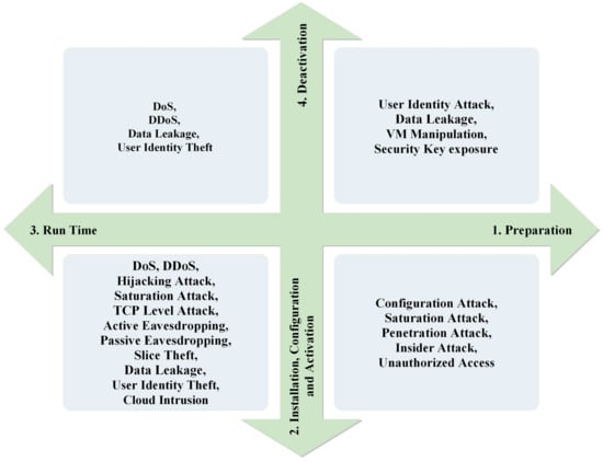 The entire life cycle of a slice can be divided into four phases [], as depicted in Figure 9, along with the respective attacks and threats associated.
