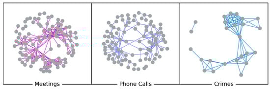 Dickison, Magnani and Rossi [2] realized a book on the evolution of interconnected social networks, dynamic processes, data collection, data analysis, modeling and mining of multilayer social network systems. According to the authors, we can find multilayer social networks in different contexts. They are generated from data of different sizes, natures and layer semantics. More specifically, during SNA studies, many multilayer networks with actors connected by multiple types of edges have been created from offline questionnaires or interviews. They are often networks of small sizes, and they can be very useful in testing new methods. The only multilayer criminal network is the one described by Bright et al. [13]. This network has eight layers with a specific type of edge related to the exchange of drugs, money and other particular resources. The authors explored the actor’s strategic positions across the eight layers. They recognized the importance of multiplex data in criminal network analysis, but their results were limited to an aggregate network, which was obtained by summing up all interactions across the whole network while neglecting the layered structure.