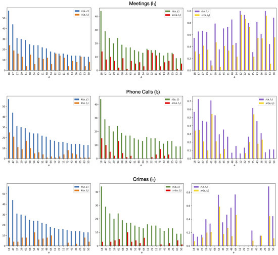 In [36], we proposed a unique multilayer mafia network. The Sicilian Mafia [37,38] is one of the most renowned criminal organizations. Each mafia group is called a cosca, family or clan. The analysis of the mafia social structure inspired great interest in the scientific community [39]. Our multilayer network was built from two simple graphs that captured the meetings and phone calls between a couple of suspected criminals identified by police audio and physical surveillance during an anti-mafia operation known as Montagna [25,29,40]. The Public Prosecutor’s Office of Messina (Sicily) concluded this investigation in 2007. Given these two single-layer networks, we build a weighted and undirected multilayer network with 154 actors, 439 intralayer edges, and 2 layers named Meetings and Phone Calls. Then, we focused on the identification of leaders within the two-layer Montagna network. We chose the degree as descriptor to identify the 20 most important actors in the network. We used three different approaches to compute degree: (i) on each layer separately, according to its standard definition on simple graphs; (ii) on the aggregated network obtained by merging the two layers of the multilayer network into a single-layer network, again according to its standard definition; and (iii) on the multilayer network, computed as the number of each actor’s relational ties on all the layers in which he exists.