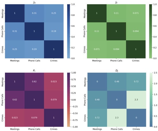 Table 5 shows the Jaccard correlation coefficient computed among pairs of layers in the Montagna multiplex network to verify the presence of the same actors on different layers. If two layers do not share any actor, the coefficient will be equal to 0. If two layers share the same actors, the coefficient will be equal to 1. In our case, we can observe the strongest overlapping between the actors in the Meetings and Phone Calls layers, which is slightly lower between the Meetings and Crimes layers, and very low between the Phone Calls and Crimes layers.