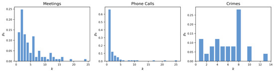 Degree distributions of the three layers—Meetings, Phone Calls and Crimes—where provides the probability that a randomly selected node in each layer has degree k.