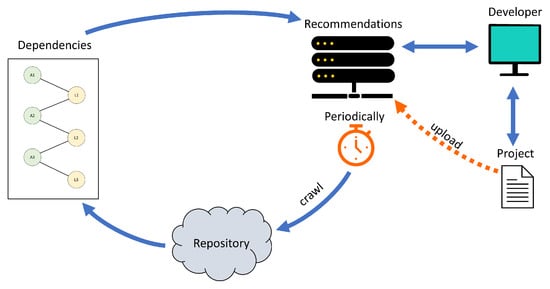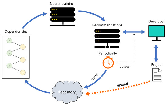 The advantage of no-learning algorithms is that, even if we consider the periodical mining of code repositories to extract new versions of dependency graphs, the latter do not make recommendation pipelines wait for their completion. In particular, for new project predictions, dependencies can be directly injected in the graphs before inference and removed afterwards—two operations with the minimal cost of, respectively, adding and removing one graph node and its edges. This is demonstrated in Figure 2, where the recommendation flow (the data flow cycle between the developer, the project, and the recommendation system) does not depend on the conclusion of periodical updates to recommend libraries.