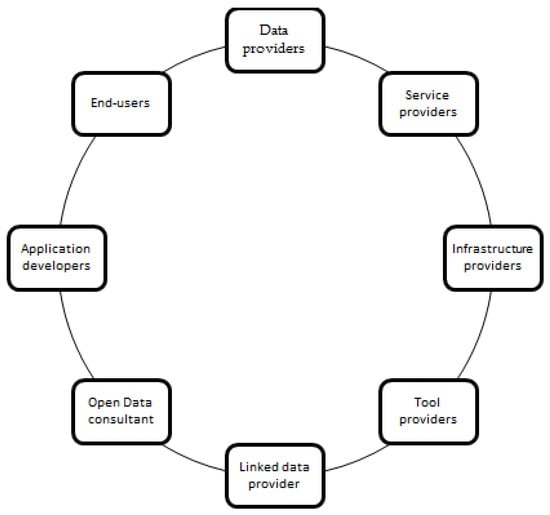 Open data ecosystems foster the exchange of ideas for new products and services among a variety of stakeholders. An open data ecosystem comprises the people and businesses that work together to create new services. There are three types of entities involved: data and infrastructure providers, application developers, and end users. The first group in the data value network comprises institutions that give data to other organizations in the ecosystem. Data providers can be institutions that distribute it without cost, either without any restrictions or licenses restricting how the data can be used. In most cases, these institutions are public administration or other public organizations with access to a large amount of information. However, they do not have the skills or means to make use of them. As a result, they give them out so that citizens and businesses can use them to develop services and help the country’s economy. Various public licenses exist under which a licensor might grant access and copyright authorization to allow free dissemination of data. Data distributors can also be institutions that generate profit by making data available [8,9,24,30].