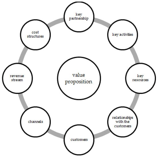 Numerous academics have made use of the well-known business model canvas, which serves as a formal framework for the development of new business models. Authors have chosen to use the elements of the business model canvas because it is a well-known model and offers a structured framework for the development of new business models [24]. This explains how an organization delivers value to one or more consumer groups, the market model and its partner network to build and distribute that value to achieve revenue streams and maximize profitability. Similar to the existing business model, the business model canvas shows how businesses provide value to one or more groups of customers, as well as how the organization is built and how it works with other companies. All of this is done to increase revenue and profit margins. The business model canvas comprises the following: key partnerships, key activities, key resources, value proposition, relationships with customers, customers, channels, revenue stream, and cost structures [8,9,24]. The building blocks included in the business model canvas are depicted in Figure 2.