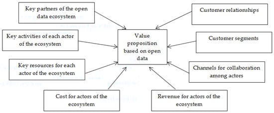 However, even though applications developers could gain many benefits from the entrepreneurial opportunities presented by open data, the lack of a value ecosystem and business models has been identified as a crucial barrier to the widespread adoption of available data in services and applications [8,9]. It is hard for developers to use data to create applications, and they do not have the technical skills to utilize data sources that use complicated data formats or interfaces. This causes these problems and challenges [20]. In addition to these barriers, the difficulty in generating relevant data for the creation of applications, the ambiguous licensing of open data, the inadequate availability to regional data sources to develop applications or local services, legal issues, the inability to ensure the quality and reliability of data, and technical limitations associated with data publishing platforms, as well as the limited access to local data and the functionality of it, can all be attributed [21,22,23]. Existing studies have provided results about business models based on open data. Still, they have not focused on the interrelations among the actors of the open data ecosystem and the required building blocks of business models in open-data-based businesses to support the activities of these actors [8,9,10,24]. As a result, this article aims to analyze how actors in an open data network collaborate and their activities to generate value. Thirteen interviews were conducted with actors in the open data network to obtain the most up-to-date information and figure out how the current ecosystem can help both actors who give data and those who use data. The business model canvas was used to analyze the findings, and the findings are represented from the perspective of each entity in the network. For the purpose of increasing open data’s value, a mind map was developed to show how the findings are connected in an attractive and easy-to-follow manner. Results show that even though there is a lot of interest in open data, a new type of business ecosystem is needed to make a win–win situation possible for everyone in the available data ecosystem. Many reasons and benefits were found in the interviews about why people want to be a part of the open data ecosystem. However, several obstacles must be thoroughly explored and overcome.