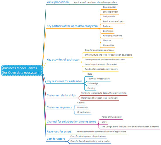 A mind map presenting the open data ecosystem business model canvas (Figure 4) was created using the free program mindmap.com (accessed on 28 March 2022). Creating a mind map is a visual representation of thoughts or concepts in order to better understand the connections between ideas and concepts. Every node in a mind map has the potential to become a new mind map. Building the mind map was based on the business model canvas for the open data ecosystem, which served as the starting point. The procedure was extended to link the thoughts together depending on their significance.