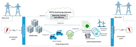 - VPP coordinates energy resources for local energy autonomy to achieve an optimal balance between the demand and supply and to minimize energy exchanges among microgrids and the main grid;