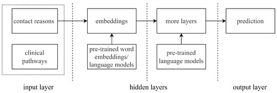As Figure 2 shows, for each architecture, “contact reason” and “clinical pathway” are used as the articles and labels. They are pre-processed and fed to the neural network as the input. When embedding the input “contact reason” texts and building other hidden layers, pre-trained language models are used depending on the neural network architecture selection.