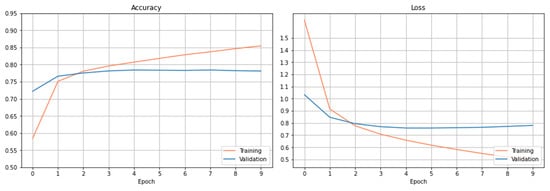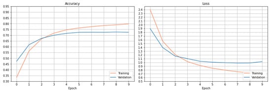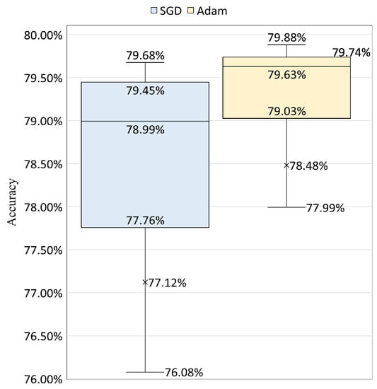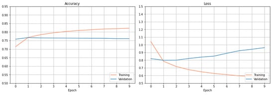 The setting of the learning rate plays a decisive role in the convergence of a neural network model. A too-small learning rate will make a training algorithm converge slowly, while a too-large learning rate will make the training algorithm diverge []. A traditional default value for the learning rate is 0.1, and we use this as a starting point on our task problem [,]. For each optimizer (Adam and SGD), we try learning rates within the set of {0.1, 0.01, , , , , }. We maintain the same training procedure as the preliminary models described in Section 4.2.3 except for changing the learning rate. We use the same number of epochs (epochs = 10) as a start. The rest of the hyperparameters remain the same (see Section 4.2.3).