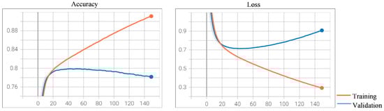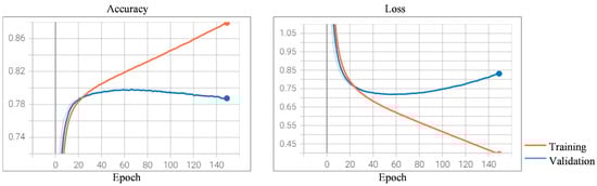 Training and validation results using the CNN-based architecture. (Left): Accuracy vs. epochs; (Right): Loss vs. epochs.