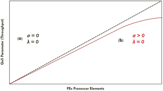 There is nearly always some efficiency loss in the real world, and if the reason for this loss can be figured out, remediation is possible. The real-world systems lag behind linear scalability a little and display retrograde scalability at some point. When we calculate this overhead, we discover a significant efficiency loss. Linearity is best thought of as a ratio of the system’s performance at a size of one. Neil Gunther [31] refers to this as efficiency. If a single node produces 1800 transactions per second, then four nodes should yield 7200 transactions per second. That would be completely efficient. If the system loses a little efficiency with each node and four nodes producing 6500 transactions per second, then the system is around 90% efficient. Figure 1a demonstrates that both and σ are zero so as to achieve linear scalability or maximum efficiency. Figure 1b indicates is zero, while σ is more significant than zero, which leads to non-linear scalability or some efficiency loss.