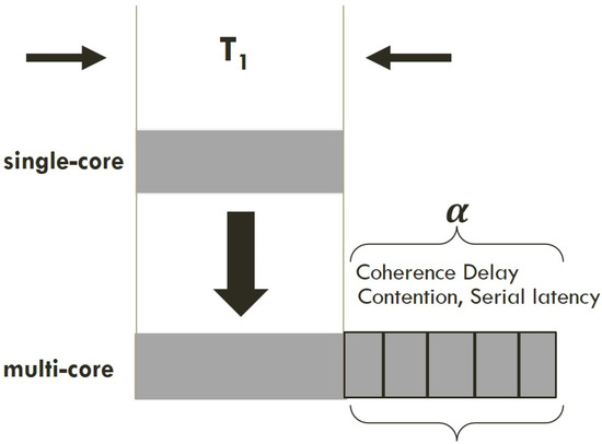 It proves that for any nonzero value of , the dual-core throughput capacity is less than twice that of the single-core system. Assuming that is only 4% of , then the dual-core processor scale-up capacity is only 1.92 of the capacity of the single-core. Consequently, if a single-core is capable of 100 transactions/sec, the dual-core will accomplish 192 transactions/sec instead of 200 transactions/sec as the expected result of naive parallelism. By expending the argument analogy with (11), the four-core response time increases each time for every core increment T1