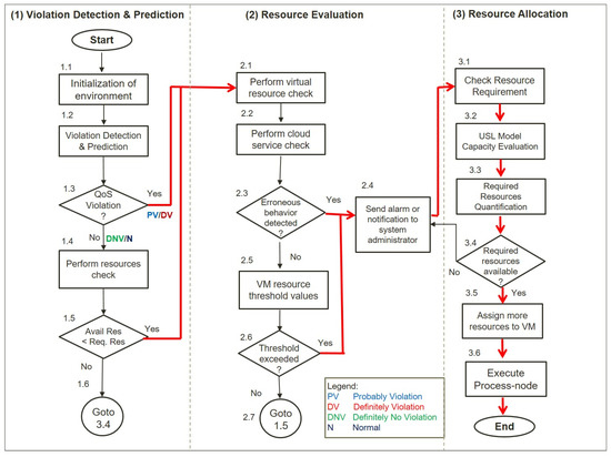 Details of the ReSQoV are explained in reference [28]. There are three primary processes, as indicated in Figure 3 (sequenced from left to right from numbers 1.1, 1.2, and so on): (1) “violation detection and prediction;” (2) “resource evaluation;” and (3) “resource allocation.” Sub-processes exist under each major process; for example, process (1) has sub-processes 1.1 to 1.6. Process (2) has sub-processes 2.1 to 2.7, and process (3) has sub-processes 3.1 to 3.6. These steps are summarized below.