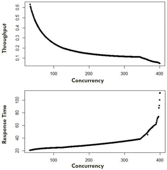 The system is an artifact using the USL package Ref. [36] in R. The data shows the throughput for variant workload and concurrency for future resource estimation. The effect of the continuous increase in workload on the throughput for switching can be easily seen. A simple scatterplot visualizes the raw data in Figure 4: Throughput to concurrency, showing the system’s throughput for consistent concurrency increases. The diagram reflects a typical example of the diminishing return effects. At the same time, Figure 5: response time to concurrency represents the system’s response time concerning concurrency.