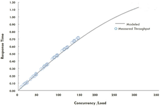 The next step is to build the Universal Scalability Law (USL) model based on the generated dataset. For model generation the usl() function is used, which creates an object that encapsulates the computation. One argument is a symbolic description of a formula, i.e., “throughput” changes concerning the concurrency or users in the system. The second argument is with regard to the dataset containing the measured values. For the dataset, the USL model is generated for its concurrency, and the response time is shown in Figure 5.