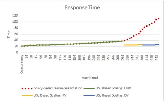 Referring to Figure 6; the red dotted line represents the CloudSim policy-based scaling where it is observed that the response time of higher workload increases. At the same time, the other three color lines depict the workload and system behavior with ReSQoV. The model triggers to allocate required resources to VM and maintains the agreed or expected response time. As shown in Figure 6, ReSQoV waits for 15 s before inserting new PEs usable in scalable processors. The Response Time in Definitely No Violation or Normal decision rule in a particular concurrent user load, no resource allocation was triggered and after Probably Violation (PV) and Definitely Violation (DV) more resources were allocated. Results are similar for all repeated experiments. These results show that policy-based scaling response time increased after a certain load (red dotted lines); on the contrary, after adding resources, the response time decreased in the limits as agreed.