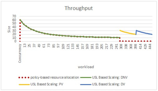 Figure 7 presents the QoS agreed throughput using USL based ReSQoV compared to policy-based resource allocation. The red dotted line represents the CloudSim policy-based scaling where after a certain workload, throughput decreases. At the same time, the other three lines depict the workload and system behavior with ReSQoV. That adds the required resources and increases and maintains the throughput in defined and expected limits. As shown in Figure 7, ReSQoV waits 15 s before inserting new PEs usable in scalable processors. The throughput in the Definitely No Violation or Normal decision rule in a particular concurrent user load is similar, and no resource allocation is triggered. However, as the user load increases and for Probably Violation and Definitely Violation, more resources are needed to allocate.