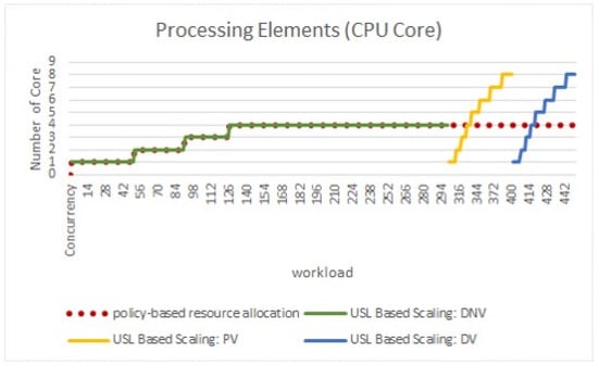 Figure 8 shows the behavior of the resource allocation to VM. In the policy-based scaling, resources are allocated gradually (red dotted lines) without considering the QoS values. At the same time, ReSQoV allocates resources more rigorously and appropriately. The VM works with the new assigned PEs when needed. It is observed that QoS parameters are not considered in policy-based resource allocation. A maximum of four PEs are allocated even though twelve scalable PEs were allocated to the VM. The results show that ReSQoV focuses on the QoS, and after allocating the required resources by considering the parallelism and serialization overheads, it ensures QoS is maintained.