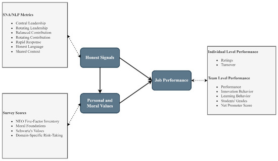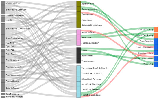 This study is the first to attempt to predict job performance through personal and moral values by building ML models based on individuals’ communication data. In terms of the effects of personal or moral values on job performance, this research implicates that there are specific personal and moral values that are predictive of individual- or team-level job performance. Therefore, this work brings new insights and implications for factors that influence the performance of employees. Particularly, the following findings and explanations, which are also summarized in Figure 7, showing the predictability between variables through flows, are derived from the developed prediction models.