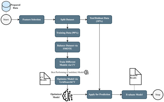 Further, data are prepared by detecting and removing outliers, identifying and merging duplicate actors in the email network, and binning the target features into the three classes of “low”, “medium”, and “high” personality or performance scores. Binning is performed for the continuous target features based on normal distribution so that the lowest-scoring 16%, the highest-scoring 16%, and the remaining 84% are binned into one category each, while categorical performance variables, e.g., managers’ ratings, are left in their natural state. After preparing the data, the process of developing the machine learning models is structured in the following way. First, a maximum of three input features are selected based on calculating the importance of the strongest correlating input features in order to avoid overfitting of the classification models. Then, the datasets are split into 90% training and 10% test data in order to ensure, in the context of the relatively small data sets, that instances of all three classes are present in the 10 folds during cross-validation as well as during testing. The classes of the training data are balanced via SMOTE, and different classification models, such as Logistic Regression, Support Vector Machines, Stochastic Gradient Descent, or XGBoost Classifiers (XGB), are approached and trained using 10-fold cross-validation (CV) [18,19,20]. Out of all approaches, the best-performing model is optimized using GridSearchCV before finally evaluating the model on the independent test set. Figure 2 describes this system setup.