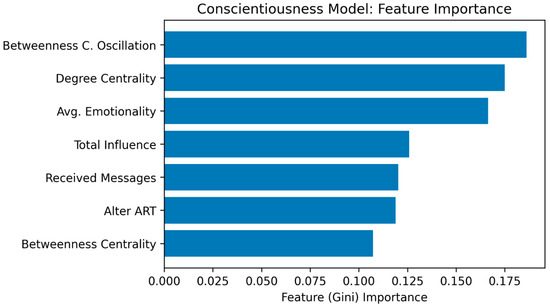 Regarding conscientiousness, for example, in addition to degree centrality, the oscillation of a person’s betweenness centrality has proven to be a substantial predictor. The model’s feature importance plot is shown in Figure 3. Accuracy scores of about 0.8 during CV and 0.889 on the holdout set, as well as a Cohen’s kappa coefficient of 0.75, indicate that the model has a validly high performance.